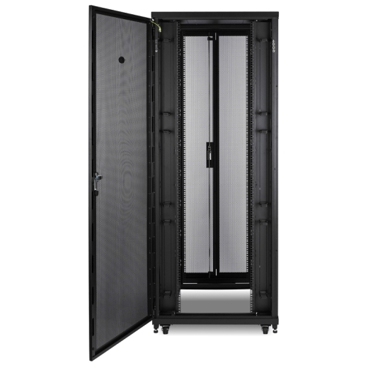 预装的后部附件安装支架 | 集成的和可调的后部附件安装支架为免工具安装的附件提供了零U安装位置。每个支架有两个安装隔室,用于支持最多四个附件为一组的组合,如机架配电单元和安装在机架中的垂直理线器。从其标准的出厂位置来调节支架或安装额外的支架(AR824002,数量为2)来安装诸如电缆管理器和垂直机架配电单元等高度达到机柜高度一半的附件。 |